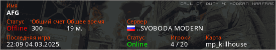 Играет на Call of Duty 4: Modern Warfare сервере. Страна: РоссияПервый раз замечен 21:44 04.03.2025