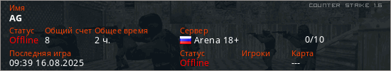 Играет на Counter Strike 1.6 сервере. Страна: РоссияПервый раз замечен 11:15 14.08.2025