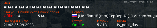 Играет на Counter Strike 1.6 сервере. Страна: РоссияПервый раз замечен 21:34 25.09.2023