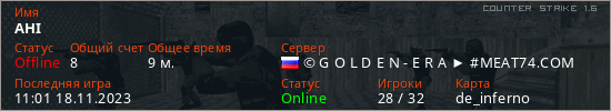 Играет на Counter Strike 1.6 сервере. Страна: РоссияПервый раз замечен 05:30 29.10.2023