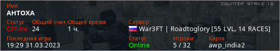 Играет на Counter Strike 1.6 сервере. Страна: РоссияПервый раз замечен 15:49 27.01.2021