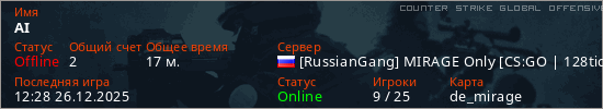 Играет на Counter Strike Global Offensive сервере. Страна: РоссияПервый раз замечен 05:50 26.12.2025
