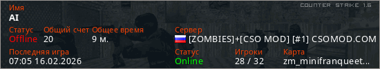 Играет на Counter Strike 1.6 сервере. Страна: РоссияПервый раз замечен 06:52 16.02.2026
