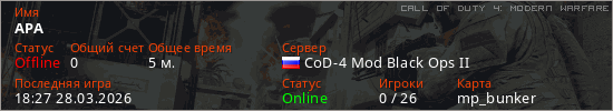 Играет на Call of Duty 4: Modern Warfare сервере. Страна: РоссияПервый раз замечен 18:21 28.03.2026