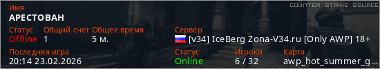 Играет на Counter Strike Source сервере. Страна: РоссияПервый раз замечен 20:12 23.02.2026