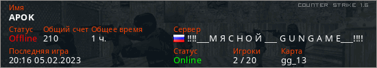 Играет на Counter Strike 1.6 сервере. Страна: РоссияПервый раз замечен 11:42 04.02.2023