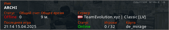 Играет на Counter Strike 1.6 сервере. Страна: ЛатвияПервый раз замечен 18:55 15.04.2025