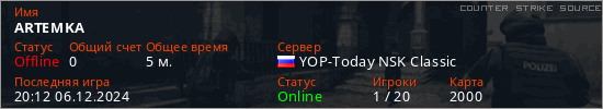 Играет на Counter Strike Source сервере. Страна: РоссияПервый раз замечен 19:53 06.12.2024