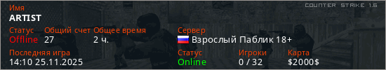 Играет на Counter Strike 1.6 сервере. Страна: РоссияПервый раз замечен 13:35 17.09.2024