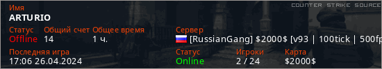 Играет на Counter Strike Source сервере. Страна: РоссияПервый раз замечен 23:30 05.05.2023