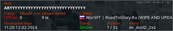 Играет на Counter Strike 1.6 сервере. Страна: РоссияПервый раз замечен 17:12 15.07.2023