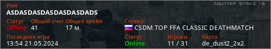 Играет на Counter Strike 1.6 сервере. Страна: РоссияПервый раз замечен 14:54 19.05.2024