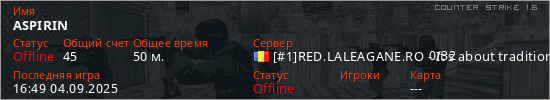 Играет на Counter Strike 1.6 сервере. Страна: РумынияПервый раз замечен 17:05 29.08.2025