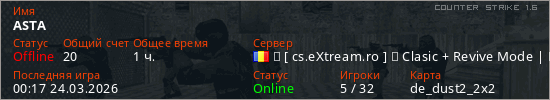 Играет на Counter Strike 1.6 сервере. Страна: РумынияПервый раз замечен 00:26 13.03.2026