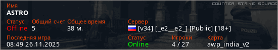 Играет на Counter Strike Source сервере. Страна: РоссияПервый раз замечен 07:50 07.04.2025