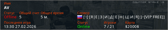 Играет на Counter Strike 1.6 сервере. Страна: РоссияПервый раз замечен 13:24 27.02.2026