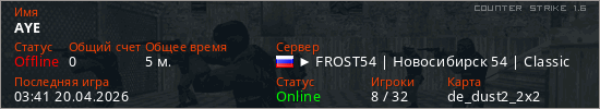 Играет на Counter Strike 1.6 сервере. Страна: РоссияПервый раз замечен 03:32 20.04.2026
