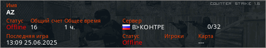 Играет на Counter Strike 1.6 сервере. Страна: РоссияПервый раз замечен 08:07 20.06.2022