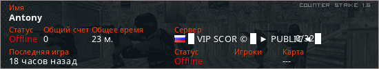 Играет на Counter Strike 1.6 сервере. Страна: РоссияПервый раз замечен 22:19 13.03.2026