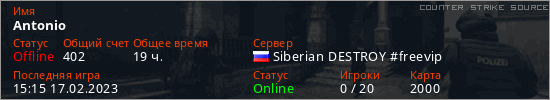 Играет на Counter Strike Source сервере. Страна: РоссияПервый раз замечен 17:04 07.02.2023