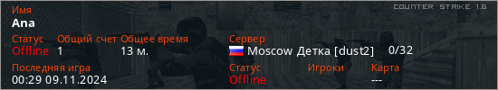 Играет на Counter Strike 1.6 сервере. Страна: РоссияПервый раз замечен 21:35 04.11.2024