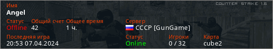 Играет на Counter Strike 1.6 сервере. Страна: РоссияПервый раз замечен 23:02 14.05.2023