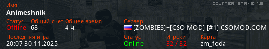 Играет на Counter Strike 1.6 сервере. Страна: РоссияПервый раз замечен 18:31 06.04.2025