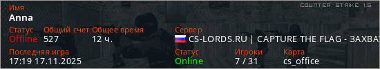 Играет на Counter Strike 1.6 сервере. Страна: РоссияПервый раз замечен 08:54 17.07.2021