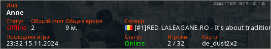 Играет на Counter Strike 1.6 сервере. Страна: РумынияПервый раз замечен 12:40 28.08.2023