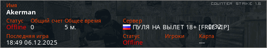 Играет на Counter Strike 1.6 сервере. Страна: РоссияПервый раз замечен 18:40 06.12.2025