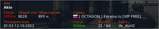 Играет на Counter Strike Source сервере. Страна: РоссияПервый раз замечен 08:54 06.02.2021