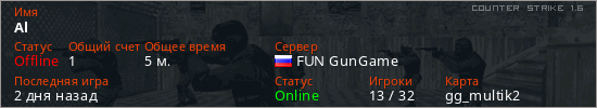Играет на Counter Strike 1.6 сервере. Страна: РоссияПервый раз замечен 20:05 23.02.2026