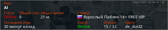 Играет на Counter Strike 1.6 сервере. Страна: РоссияПервый раз замечен 18:44 30.12.2025