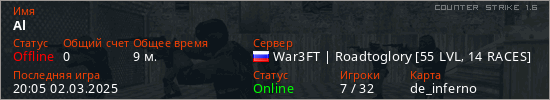 Играет на Counter Strike 1.6 сервере. Страна: РоссияПервый раз замечен 20:17 23.06.2024