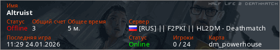 Играет на Half Life 2 DeathMatch сервере. Страна: РоссияПервый раз замечен 10:45 24.01.2026
