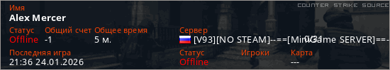 Играет на Counter Strike Source сервере. Страна: РоссияПервый раз замечен 21:29 24.01.2026
