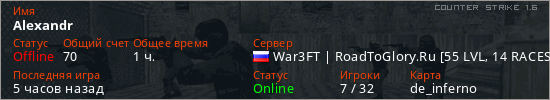 Играет на Counter Strike 1.6 сервере. Страна: РоссияПервый раз замечен 20:49 21.03.2026