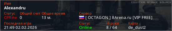 Играет на Counter Strike Source сервере. Страна: РоссияПервый раз замечен 21:41 21.01.2026