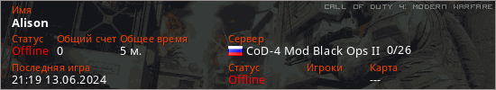 Играет на Call of Duty 4: Modern Warfare сервере. Страна: РоссияПервый раз замечен 21:17 13.06.2024