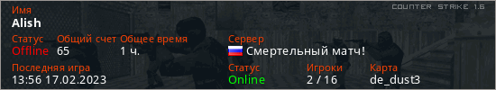 Играет на Counter Strike 1.6 сервере. Страна: РоссияПервый раз замечен 12:30 30.01.2023