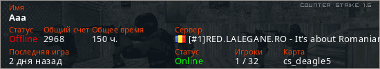 Играет на Counter Strike 1.6 сервере. Страна: РумынияПервый раз замечен 15:58 29.05.2022