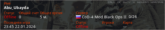 Играет на Call of Duty 4: Modern Warfare сервере. Страна: РоссияПервый раз замечен 23:20 22.01.2026