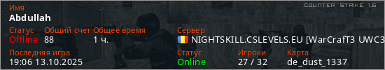 Последний раз был в сети 19:06 13.10.2025 Игрок с таким ником замечен на 19 серверах