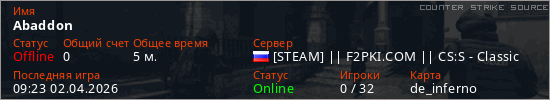 Играет на Counter Strike Source сервере. Страна: РоссияПервый раз замечен 08:33 02.04.2026