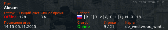 Играет на Counter Strike 1.6 сервере. Страна: РоссияПервый раз замечен 17:28 01.11.2021