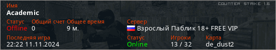 Играет на Counter Strike 1.6 сервере. Страна: РоссияПервый раз замечен 22:29 08.11.2024