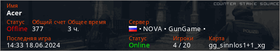 Играет на Counter Strike Source сервере. Страна: РоссияПервый раз замечен 08:35 04.10.2022