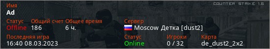 Играет на Counter Strike 1.6 сервере. Страна: РоссияПервый раз замечен 13:51 07.03.2023