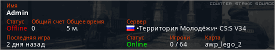Играет на Counter Strike Source сервере. Страна: РоссияПервый раз замечен 21:00 18.01.2026