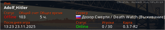 Последний раз был в сети 13:23 23.11.2025 Игрок с таким ником замечен на 10 серверах